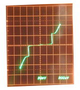 | Figure 3.IV-curve of Al STJ. Horizontal axis is the applied voltage and the vertical is the resulting current through the STJ. The step shape shows the STJ is behaving as superconductor. |