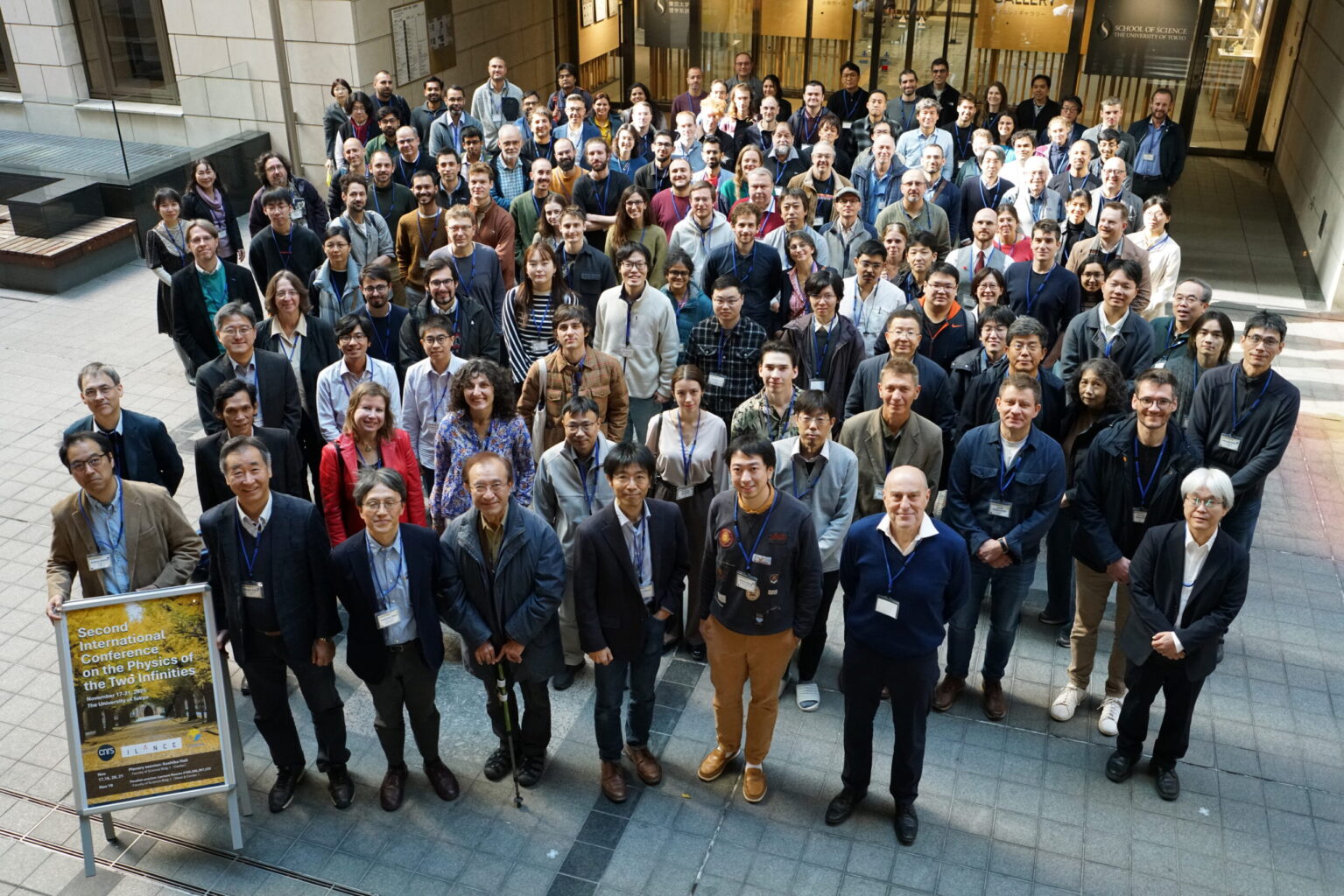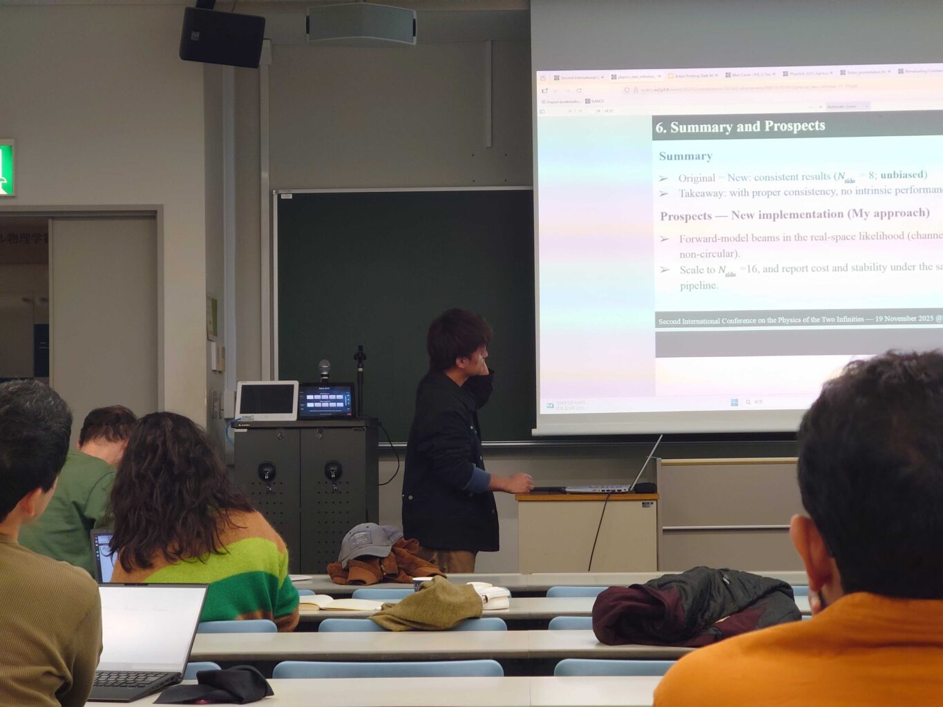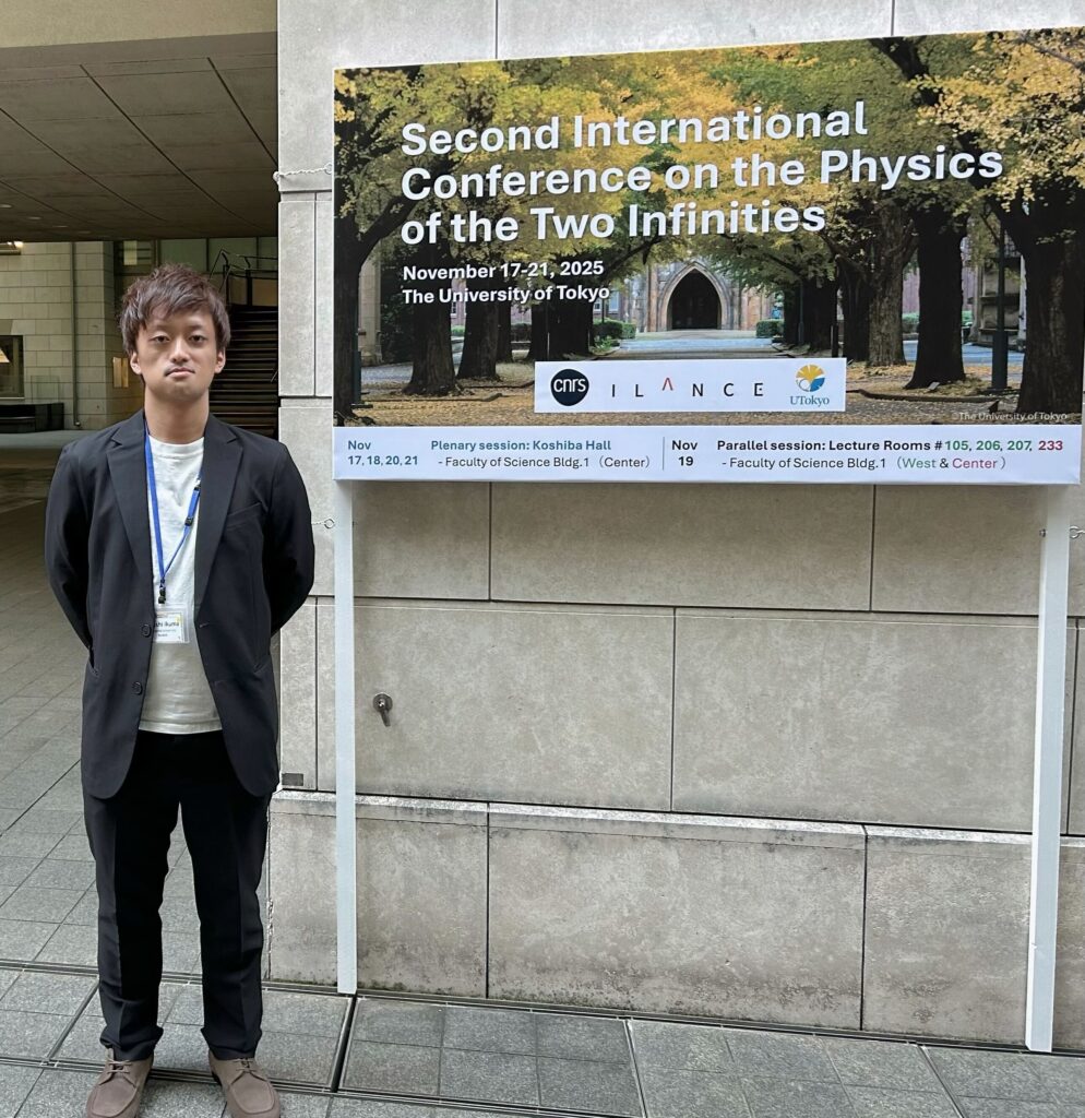 2025年11月17日〜21日に東京大学本郷キャンパスで開催された国際会議 “Second International Conference on the Physics of the Two Infinities” にD1の生熊さんが参加し、口頭発表を行いました。発表タイトルは “Hybrid Delta-map: Combining Harmonic and Real-space Methods for CMB Foreground Removal” で、宇宙マイクロ波背景放射(CMB)の前景除去手法に関する研究内容を報告しました。これまでの研究成果を整理するとともに、今後の課題や研究の方向性を改めて検討することができ、大変有意義な学会参加となりました。