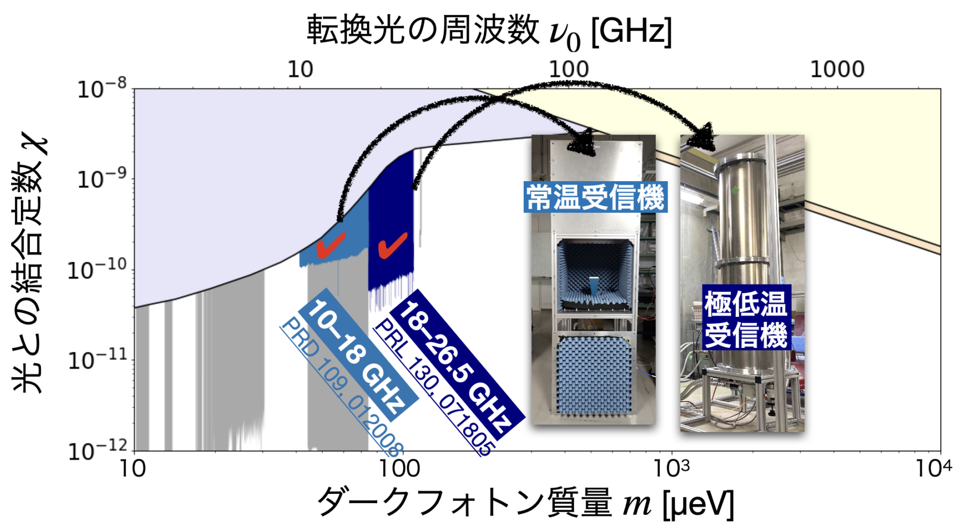 金属板でダークマターが転換する時に生じる、非常に微弱なミリ波をミリ波受信機で捉え、ダークマターの検出を目指す実験プロジェクトが、「DOSUE-RR(どすえ・ダブルアール)」です。この名称は、Dark-photon dark-matter Observing System for Un-Explored Radio-Range の略です。今まで、複数の受信機を開発し、それぞれの周波数帯域に相当する質量範囲でダークフォトンを探索してきました [S. Kotaka, S. Adachi et al. (DOSUE-RR Collaboration), PRL 130 (2023) (Link)] [S. Adachi, R. Fujinaka, et al. (DOSUE-RR Collaboration), PRD 109 (2024) (Link)]。これらの実験では、極低温(-270℃)まで冷却した受信機も用いることで、徹底的にノイズを除去して、より高感度に微弱な信号を捉えようと工夫しています。