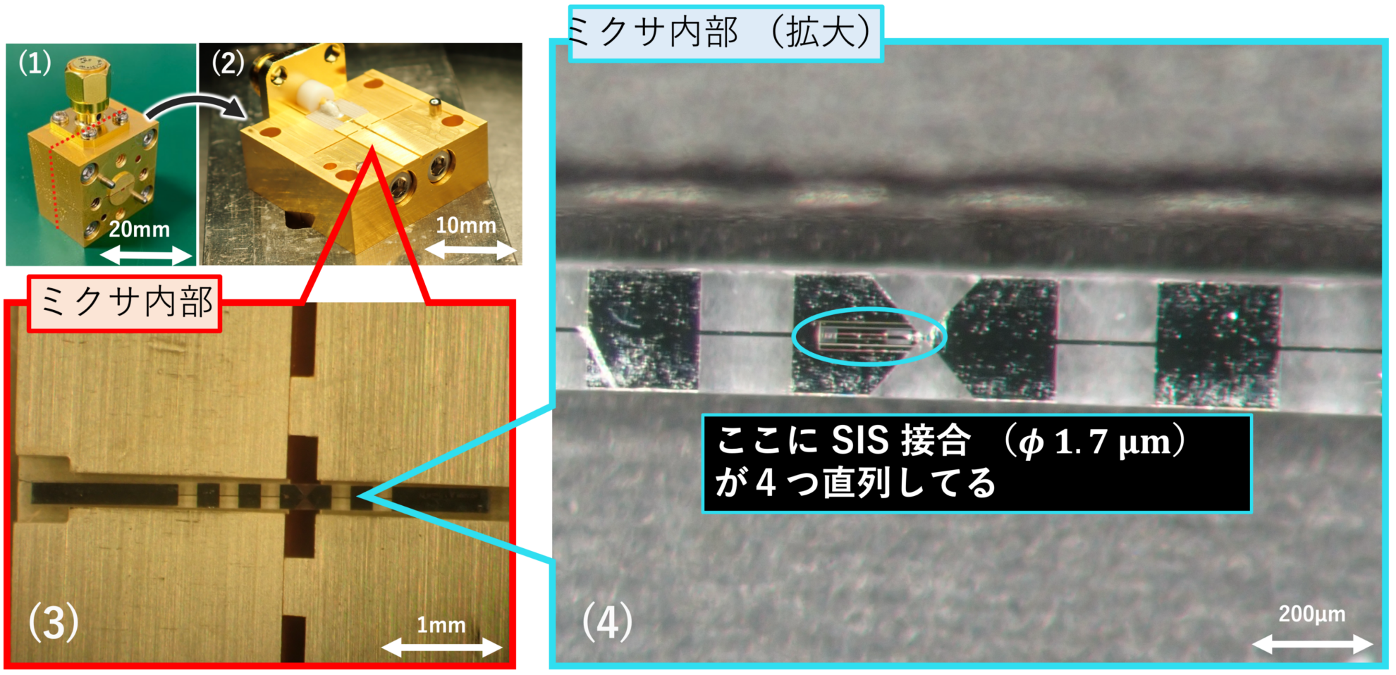 特に、100 GHz を超える高い周波数では、それを受信するために特殊な素子が必要になります。その要となるのが、超伝導検出器である「SIS ミクサ」です。この素子は、SIS 接合と呼ばれる超伝導物質の間を絶縁体ではさんだ接合を持ち、その接合において電流が絶縁体を飛び越えて流れる量子トンネル効果を利用して、高感度に周波数を変換する機能を持ちます。