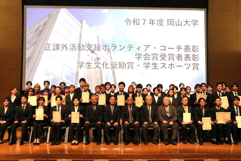 3月23日、令和7年度「岡山大学正課外活動支援ボランティア・コーチ表彰」、「岡山大学学会賞受賞者表彰」、「岡山大学学生文化奨励賞・学生スポーツ賞」の表彰式を創立五十周年記念館で開催しました。